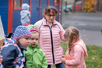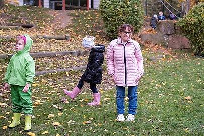 Ihrer Autorität tut das keinen Abbruch. Marianne Marks hat eine volle Stelle und ist die zentrale Ansprechpartnerin für die Regenbogengruppe. Ihre beiden Teilzeit-Kolleginnen halten große Stücke auf sie: "Sie ist ein unglaublich herzlicher Mensch mit einer ebenso herzlichen Beziehung zu den Kindern", sagt Erzieherin Sandra Rieß. "Und sie kann toll erzählen." Heute hat Marianne Marks im Stuhlkreis erklärt, was es mit der gesunden Ernährung auf sich hat. Jetzt geht es erst einmal an die frische Luft. Bevor die Kinder zu Rutsche, Schaukel und Sandkasten stürmen, müssen sie allerdings warten. Marianne Marks geht nicht allein mit den Mädchen und Jungen in den Garten. Mit 1,30 Meter hat sie keine Übersicht über das Gelände. Deswegen beaufsichtigt sie die Kinder draußen nur zusammen mit einer Kollegin.