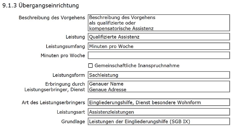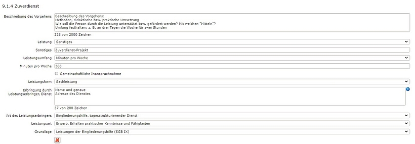 Es sollten nur die Felder in Abschnitt 9 ausgefüllt werden, die notwendig sind, um eine sinnvolle, vereinfachte Darstellung der Teilhabeleistungen anderer Leistungsträger oder von Personen/Diensten im Sozialraum im Abschnitt 16.4 (Übersicht) zu generieren: