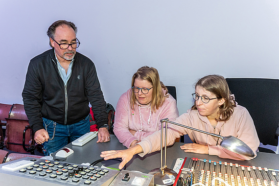 Fasziniert von der Licht-Schaltanlage im Ständehaus: Julia Pagel (Mitte) und Pauline Naumann, beide sonst auf dem Hofgut Rocklinghausen beschäftigt, probierten die Lichteffekte aus, links LWV-Haustechniker Bernd Kolbig. (Foto: Lothar Koch)