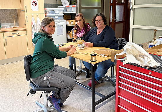 Erst zugeschaut, dann mitgemacht: LWV-Landesdirektorin Susanne Simmler (rechts) beim „Schichtwechsel“ in der Bürstenmacherei der Hephata Diakonie in Schwalmstadt-Treysa, zusammen mit der WfbM-Beschäftigten Kristin Sakarjan (Mitte) und Arbeitsgruppenleiterin Merve Hamel (links). (Foto: Hephata)