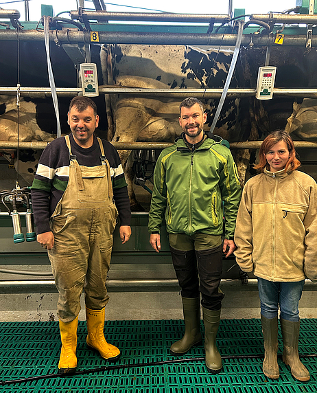 Im Kuhstall: Michael Wehling aus der LWV-Personalabteilung (Mitte), hier mit den WfbM-Beschäftigten Matthias Barth (links) und Marcella Massa (rechts) auf dem Hofgut Rocklinghausen. (Foto: Lebenshilfe-Werk)
