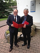 Kassel/Gießen (lwv): Landesdirektor Uwe Brückmann hat Manfred Huberti heute in Gießen die Ehrenplakette des LWV Hessen in Silber überreicht. „Ich möchte die Lebensleistung eines Mannes würdigen, der 42 Jahre lang im Dienst des LWV gestanden hat, seit 2009 als Vorsitzender des Konzern-Betriebsrats der Vitos GmbH“, sagte Brückmann, der zugleich Aufsichtsratsvorsitzender der Vitos GmbH ist. „Ohne das Verhandlungsgeschick von Herrn Huberti, seine Hartnäckigkeit und Fairness wäre manche Lösung, wäre manche Einigung wohl nicht zustande gekommen.“