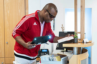 "Mein Beruf ist meine Berufung", sagt Elliot Young und strahlt zufrieden. Seine nächste Patientin in der Physiotherapiepraxis Wital in der Wiesbadener Innenstadt wartet an diesem Donnerstagmorgen schon auf ihn und seine heilenden Hände. "Elliot ist nicht nur Physiotherapeut, er ist vor allem Therapeut", sagt Felix Wieland über seinen Mitarbeiter, der hochgradig sehbehindert ist. Auf dem linken Auge hat Elliot Young noch ein bis zwei Prozent Sehkraft, auf dem rechten zwei bis fünf Prozent. "Wir haben Elliot eingestellt, weil er uns rundum überzeugt hat", erklärt Johannes Schwieger, der 2020 in die Praxis als Geschäftsführer eingestiegen ist.